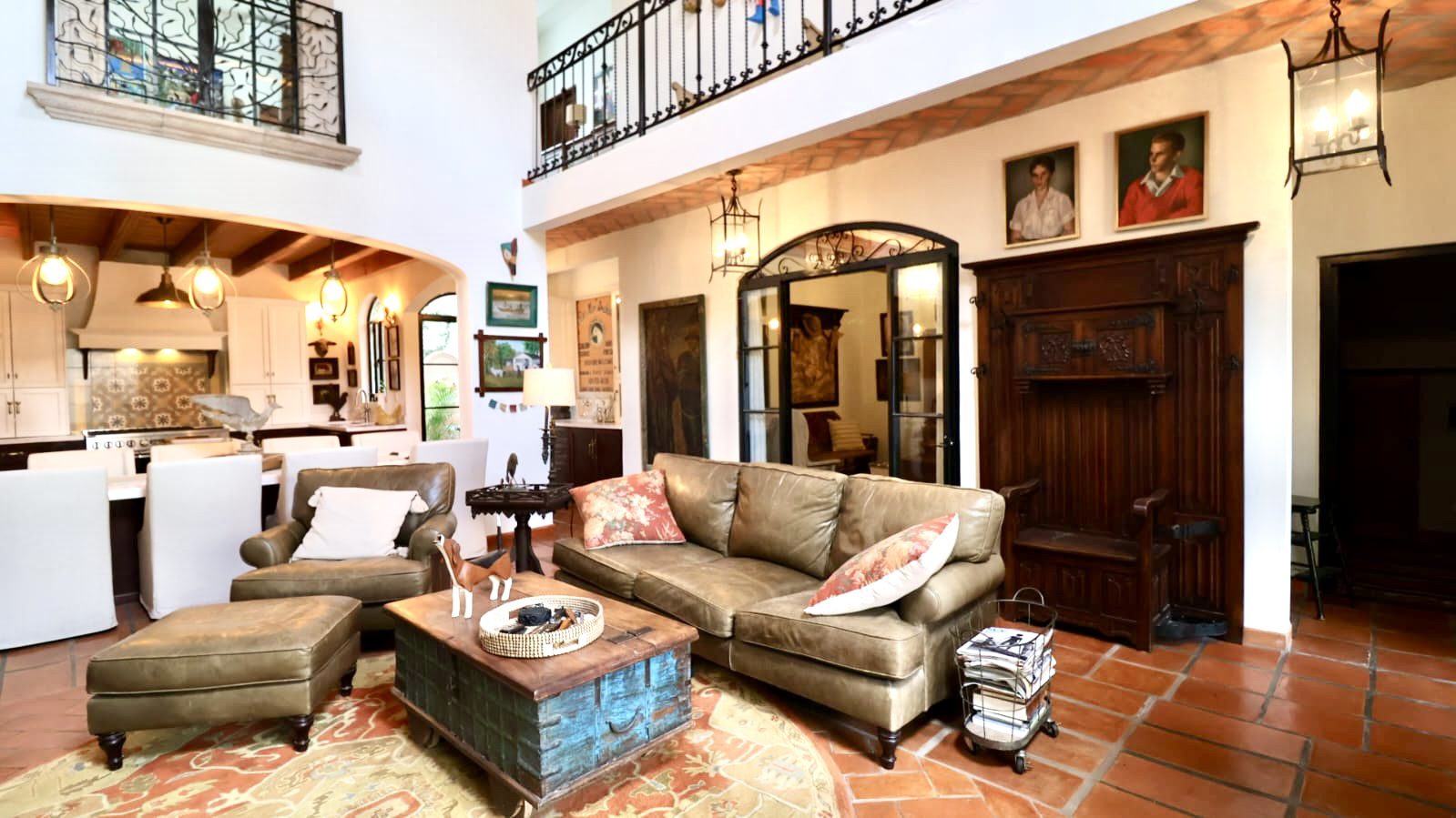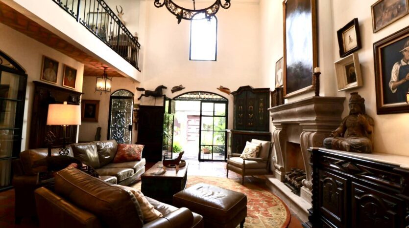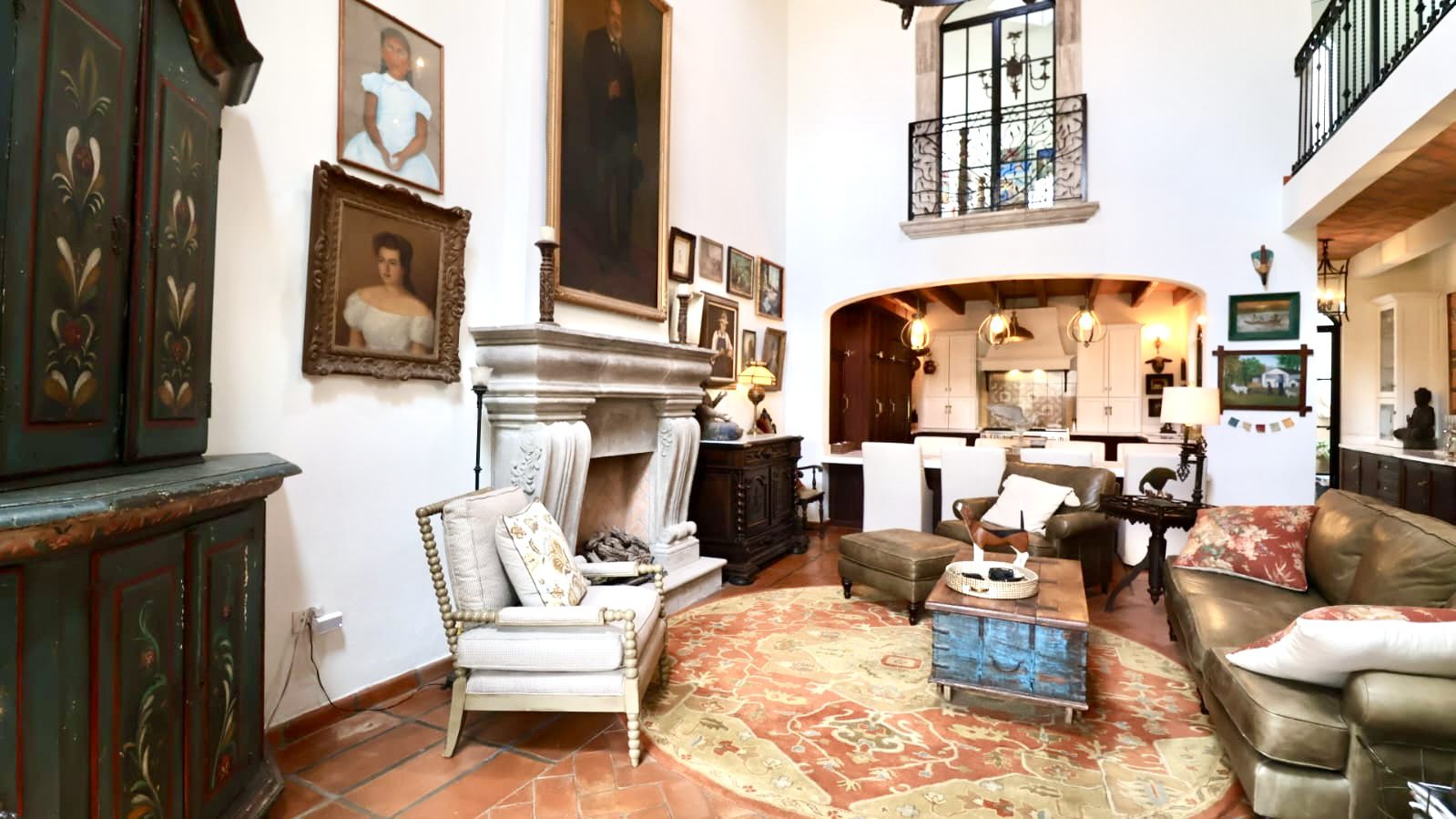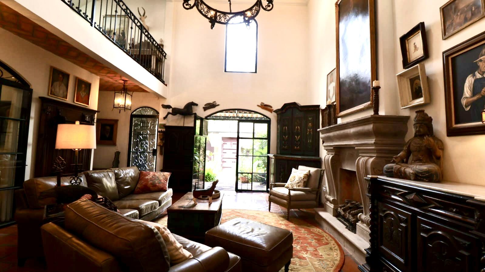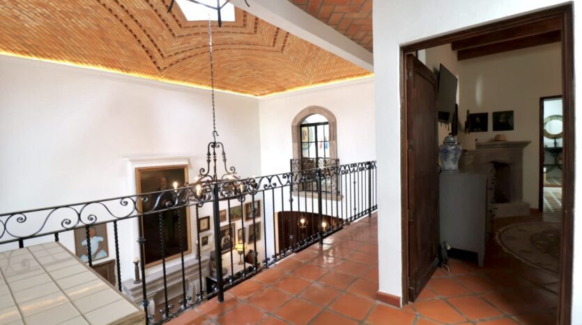 Upon crossing the threshold, light dances across the walls, enhanced by exquisite craftsmanship at every turn. Hand-forged wrought iron frames windows and railings with unique designs, while hand-painted tiles and ceramics add vibrant accents of color and tradition. The social heart of the home is a double-height living room, crowned by impressive vaulted ceilings that create a sense of grandeur and spaciousness. A majestic hand-carved cantera stone fireplace serves as the focal point, inviting intimate gatherings and providing the warmth of home. This noble material is repeated throughout in the arches that connect the spaces and on the staircase leading to the upper levels, imbuing the property with authentic San Miguel essence.