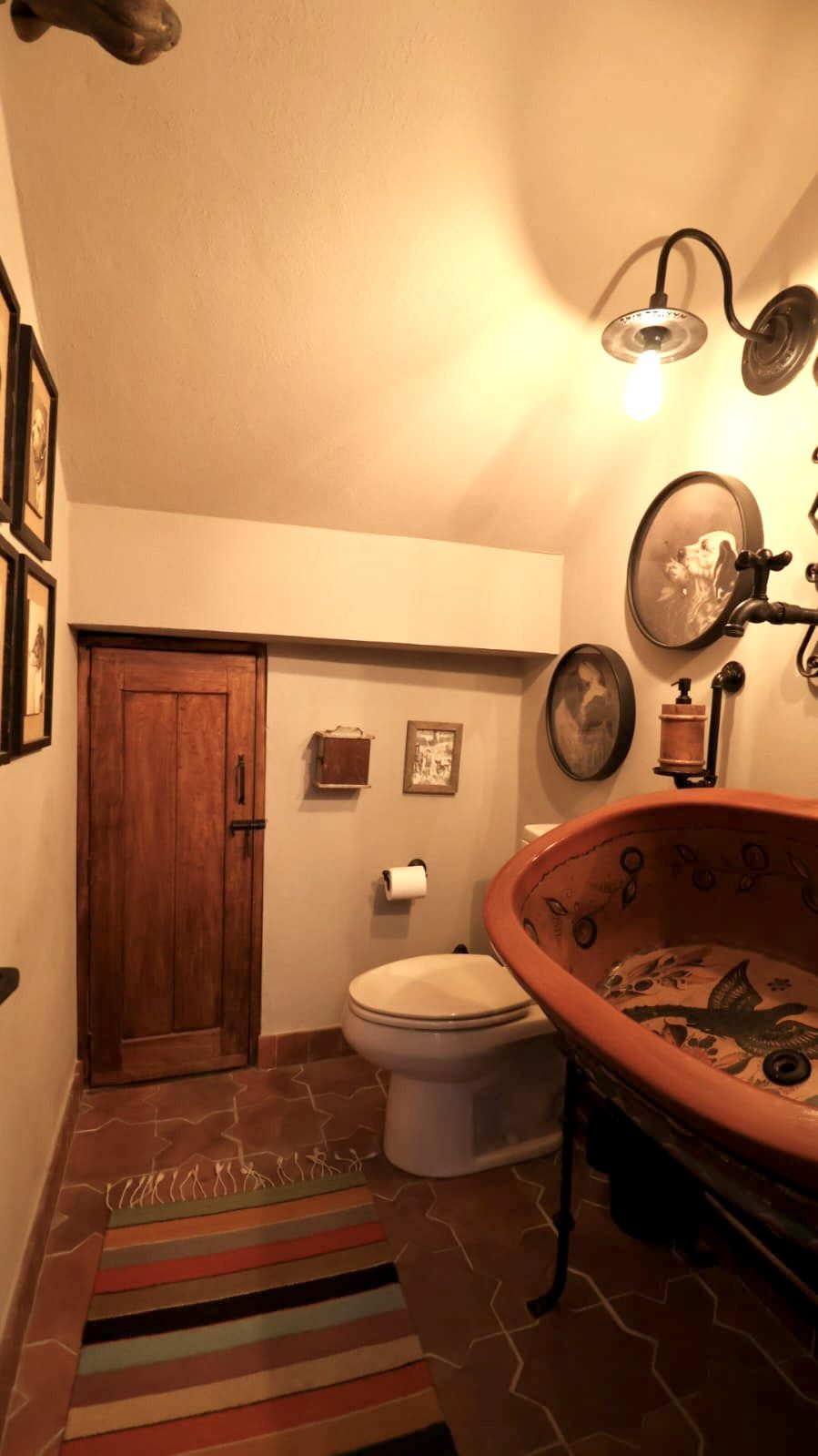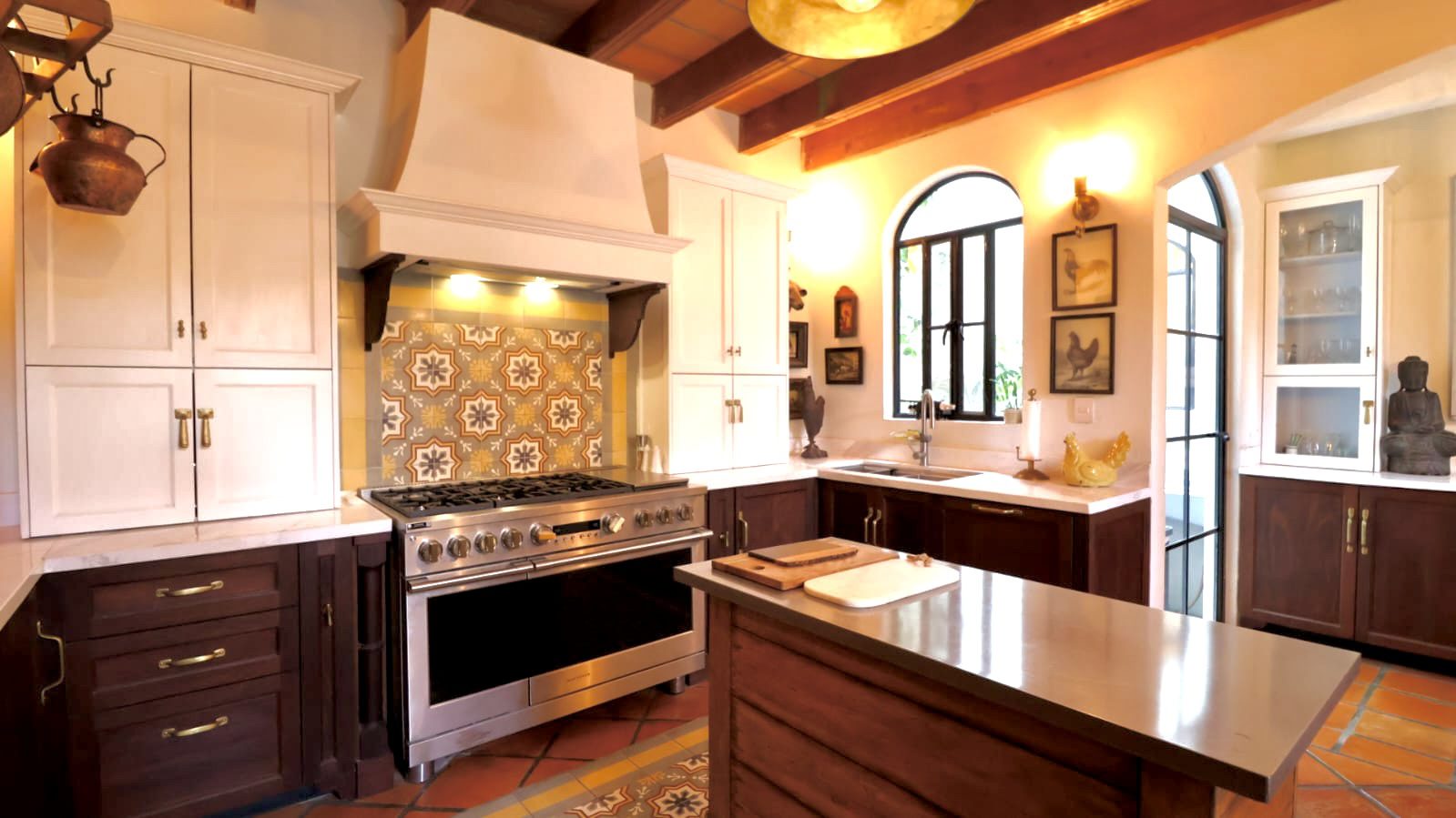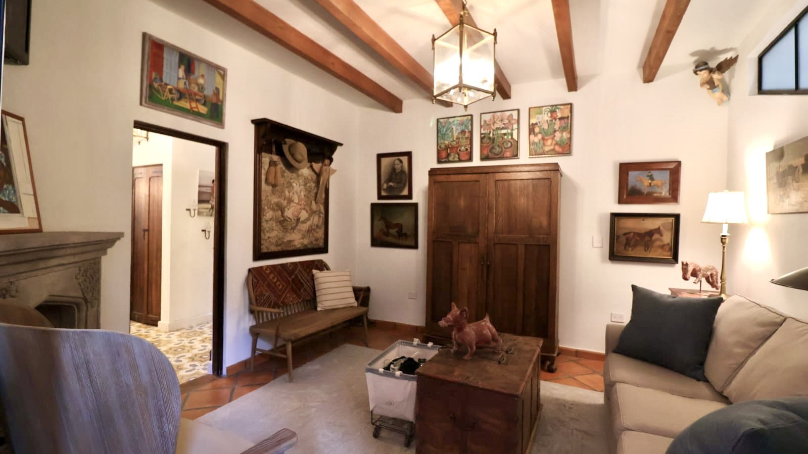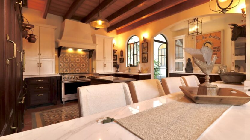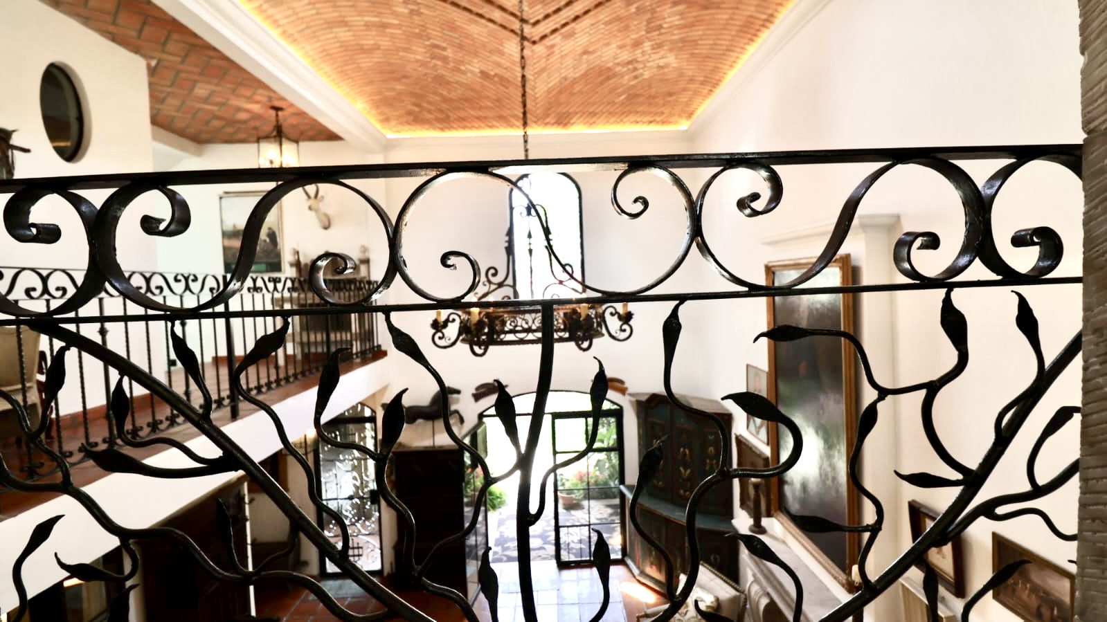 Upon crossing the threshold, light dances across the walls, enhanced by exquisite craftsmanship at every turn. Hand-forged wrought iron frames windows and railings with unique designs, while hand-painted tiles and ceramics add vibrant accents of color and tradition. The social heart of the home is a double-height living room, crowned by impressive vaulted ceilings that create a sense of grandeur and spaciousness. A majestic hand-carved cantera stone fireplace serves as the focal point, inviting intimate gatherings and providing the warmth of home. This noble material is repeated throughout in the arches that connect the spaces and on the staircase leading to the upper levels, imbuing the property with authentic San Miguel essence.