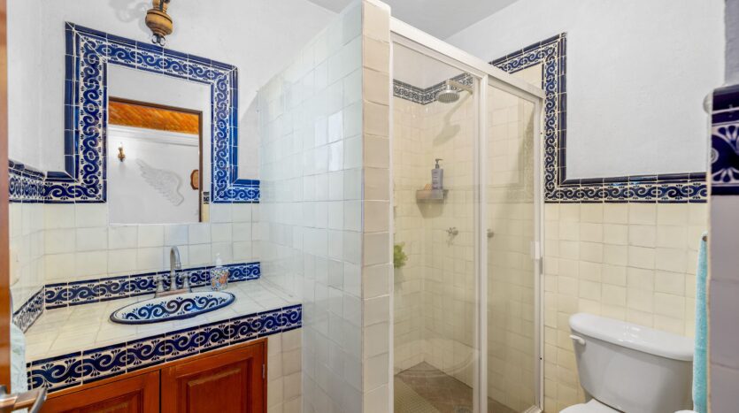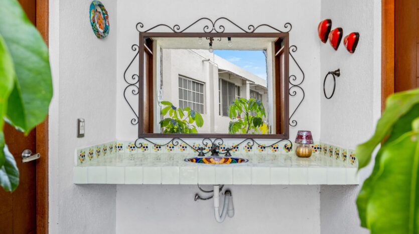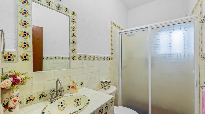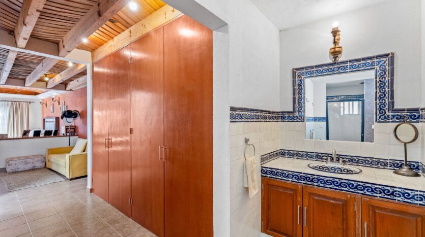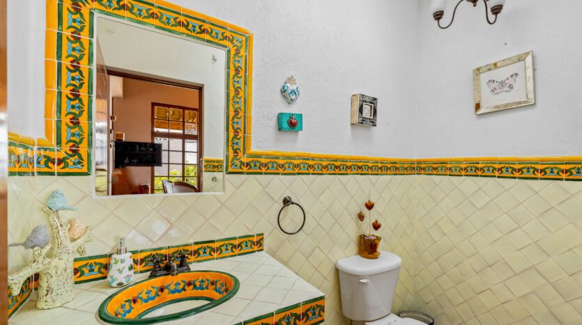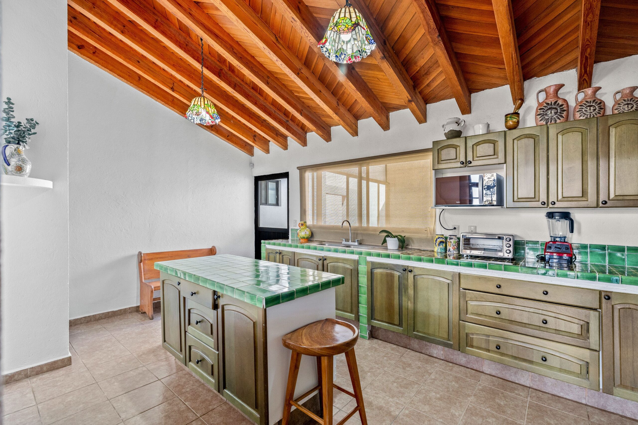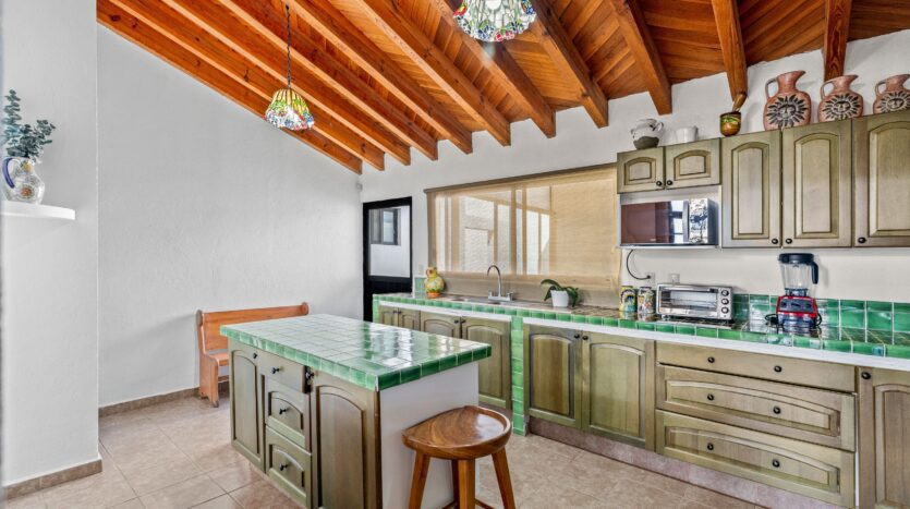 The kitchen, featuring traditional green tiled countertops and ample cabinetry, is ready to support your culinary endeavors. Bathrooms are functionally designed, some showcasing classic Mexican tilework. Throughout various living areas, the home features charming details like exposed wooden beams and tile flooring, contributing to its authentic character.