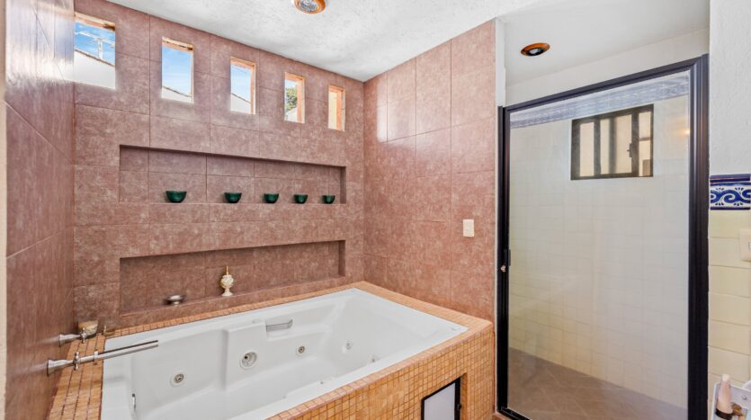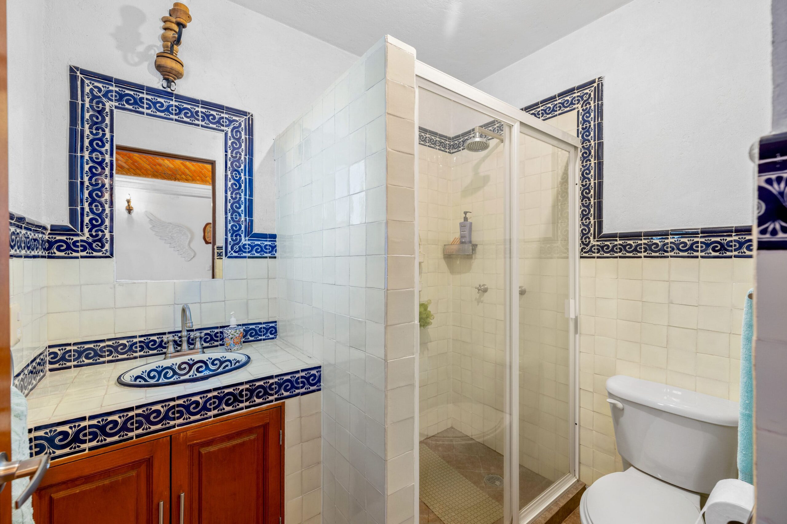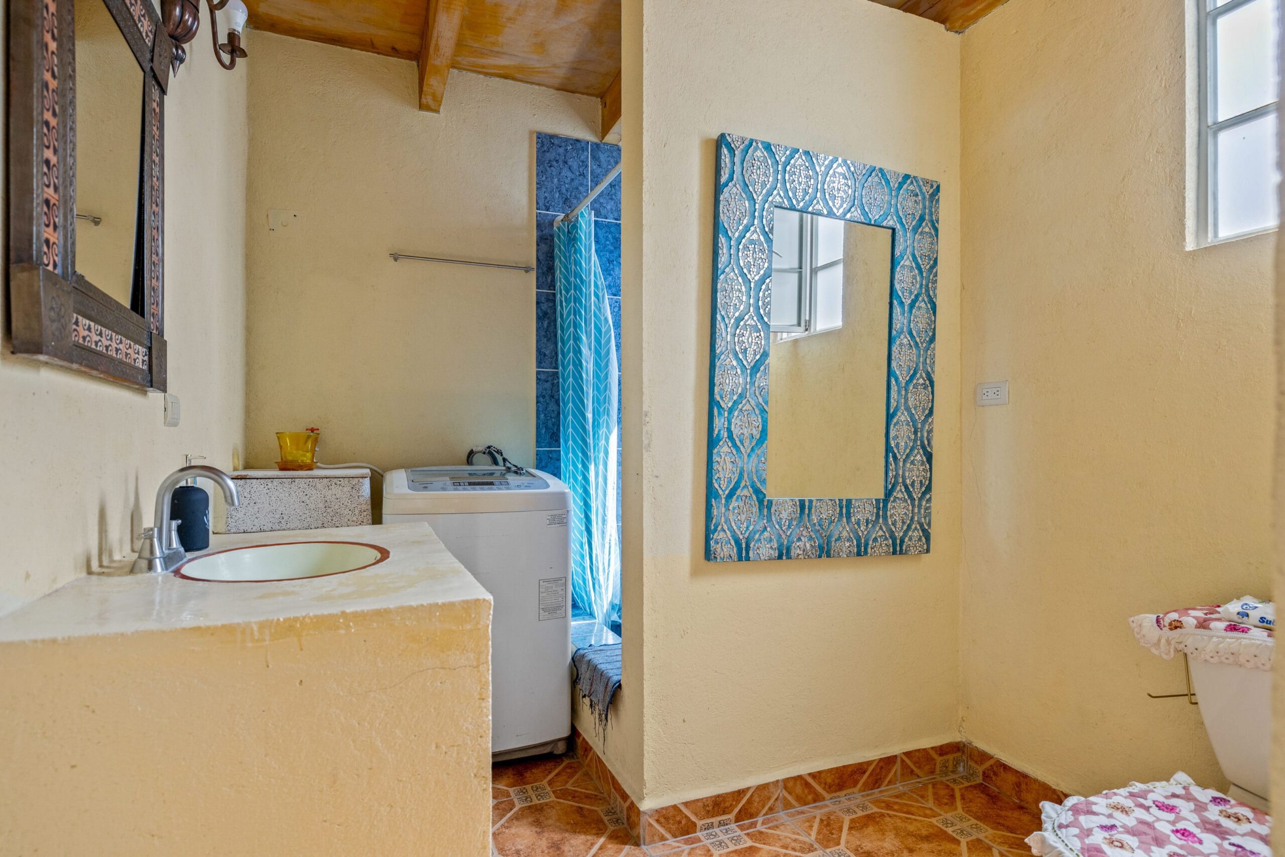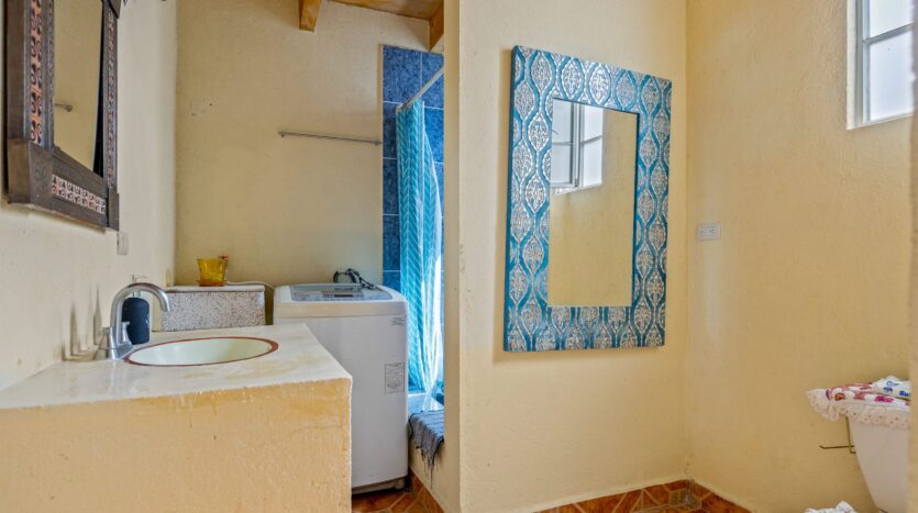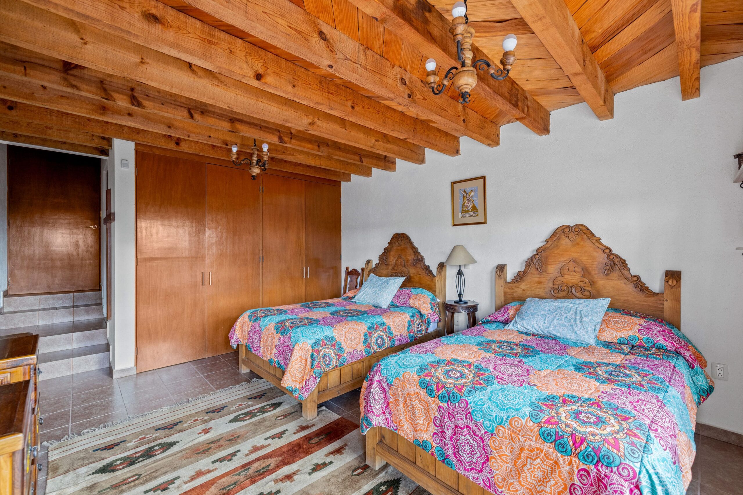The kitchen, featuring traditional green tiled countertops and ample cabinetry, is ready to support your culinary endeavors. Bathrooms are functionally designed, some showcasing classic Mexican tilework. Throughout various living areas, the home features charming details like exposed wooden beams and tile flooring, contributing to its authentic character.
