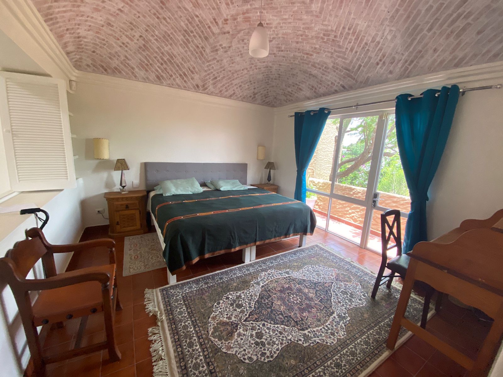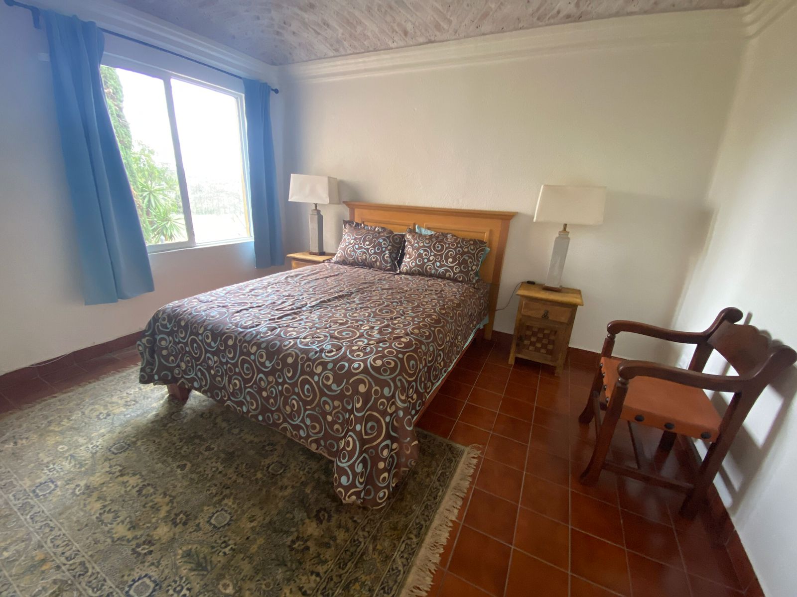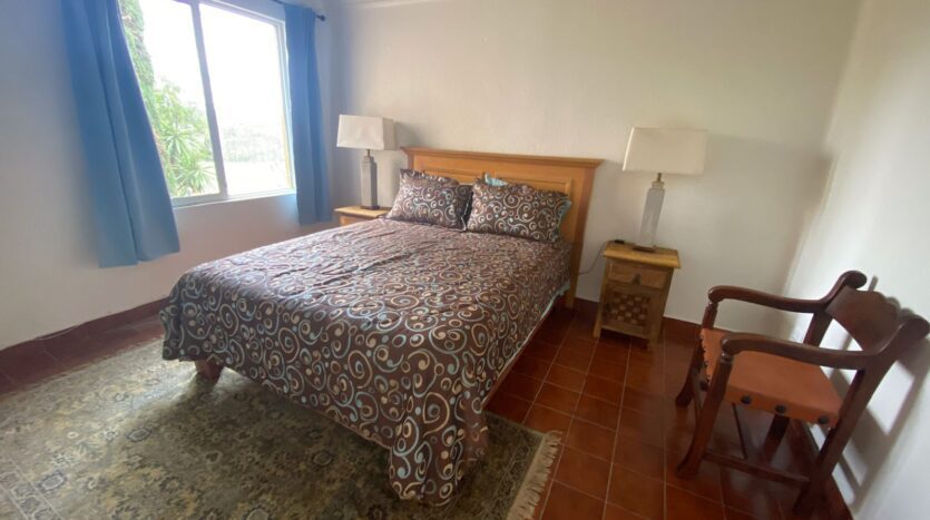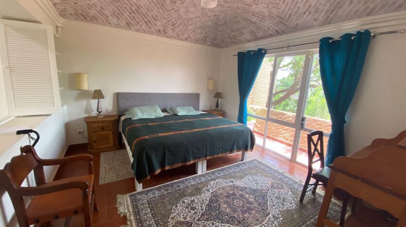 The bedrooms, one of which features the distinctive bóveda ceiling, offer a serene atmosphere for rest. The main bedroom comes with a comfortable queen-size bed, with the flexible option to be configured with two single beds upon request.