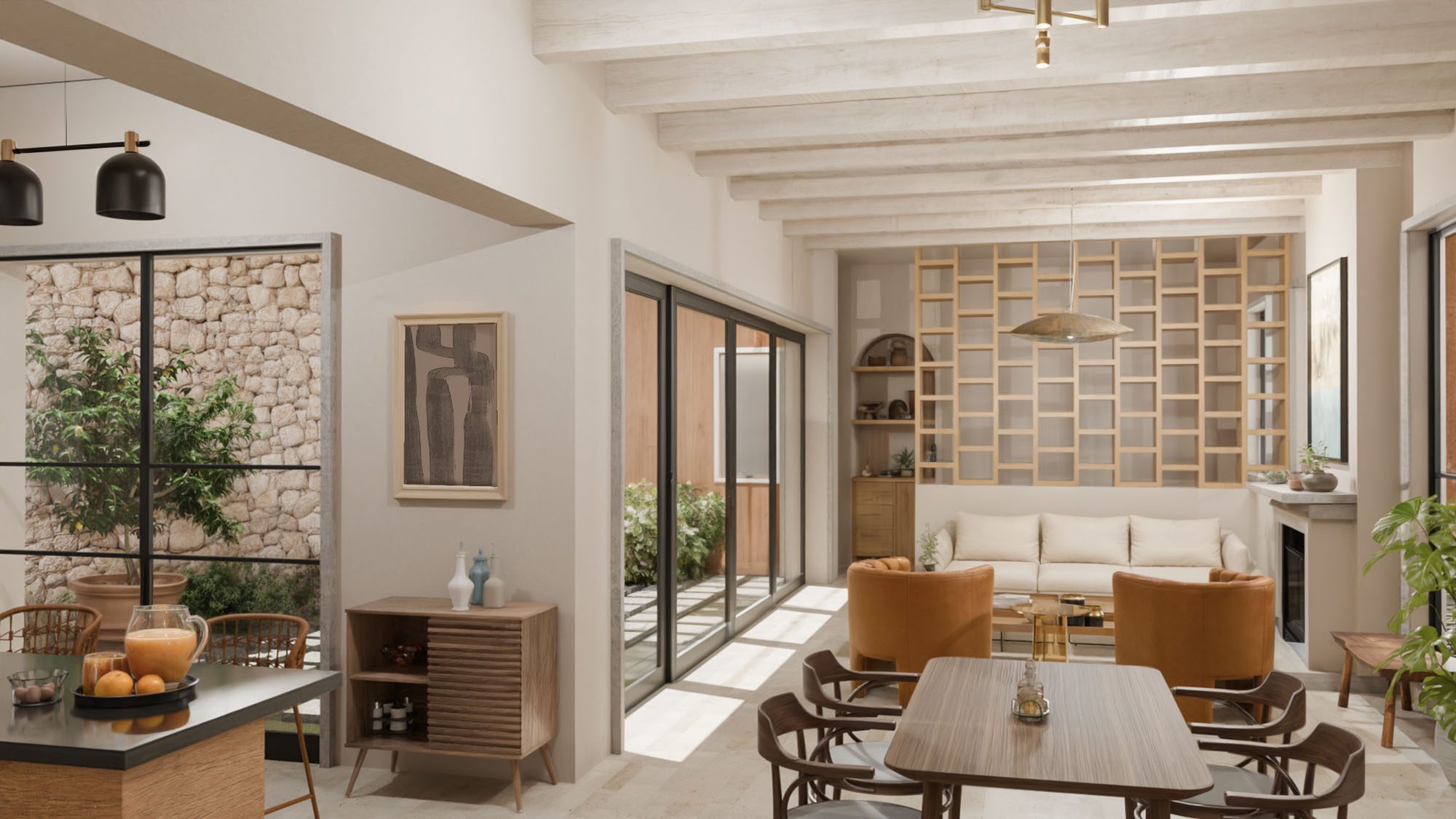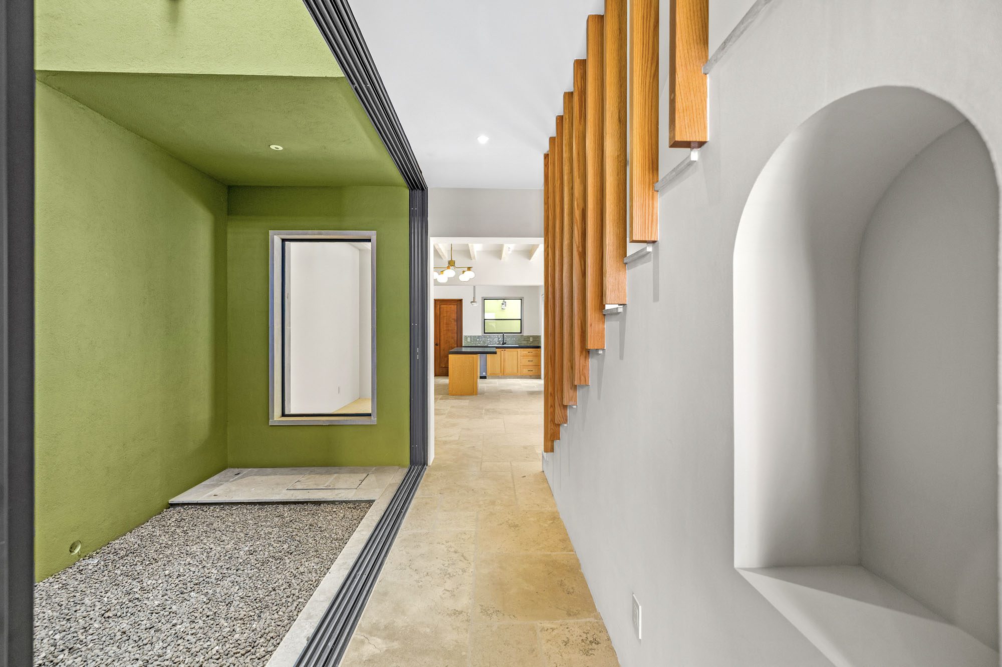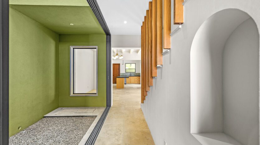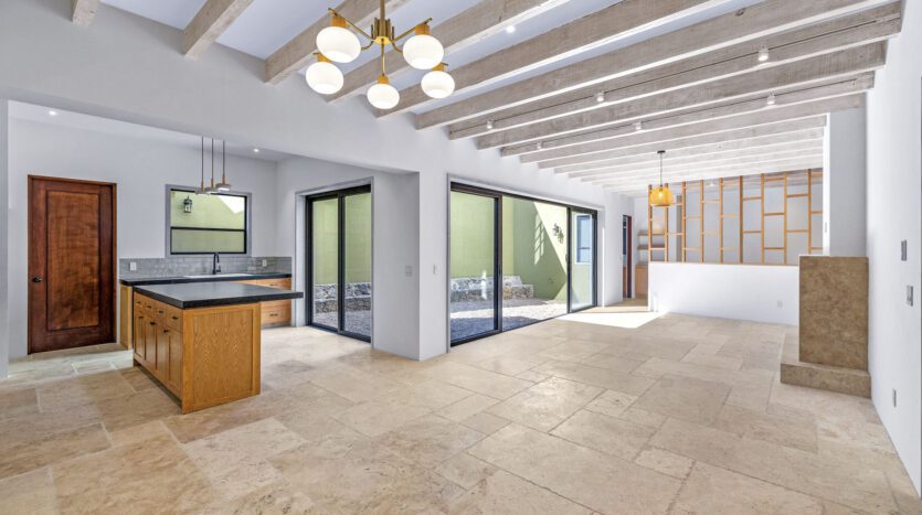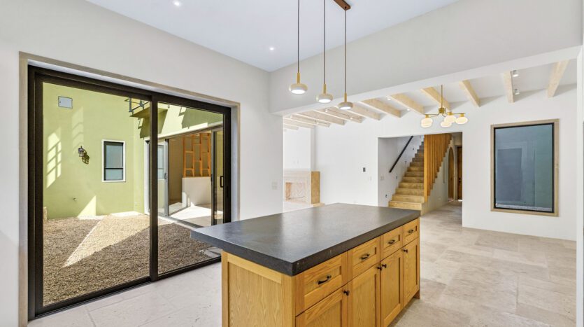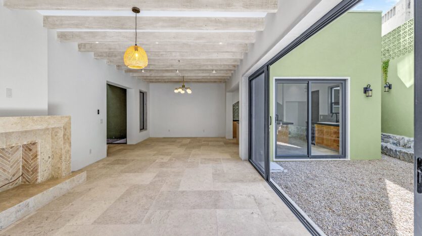 The home features a spacious open-concept layout that seamlessly connects living, dining, and kitchen areas, creating a bright and welcoming atmosphere. A central interior patio fills the home with natural light, enhancing the sense of openness and tranquility throughout.
